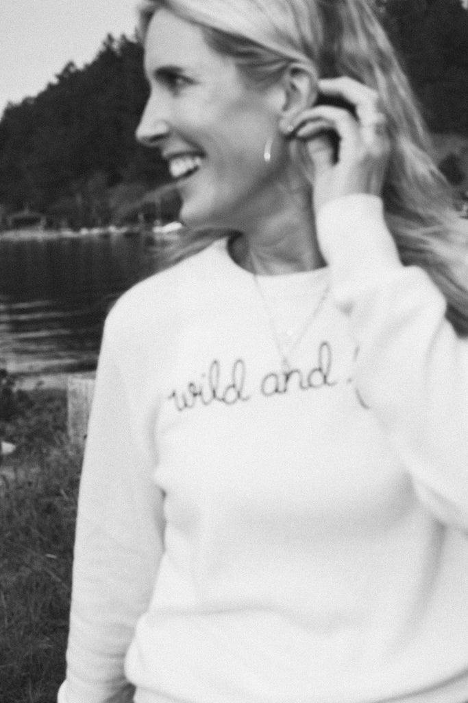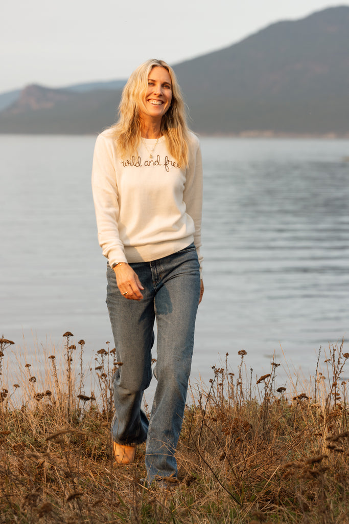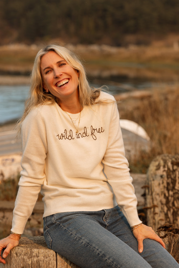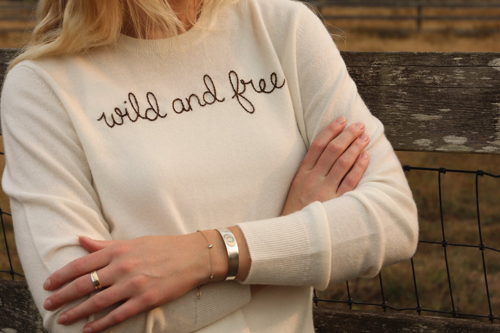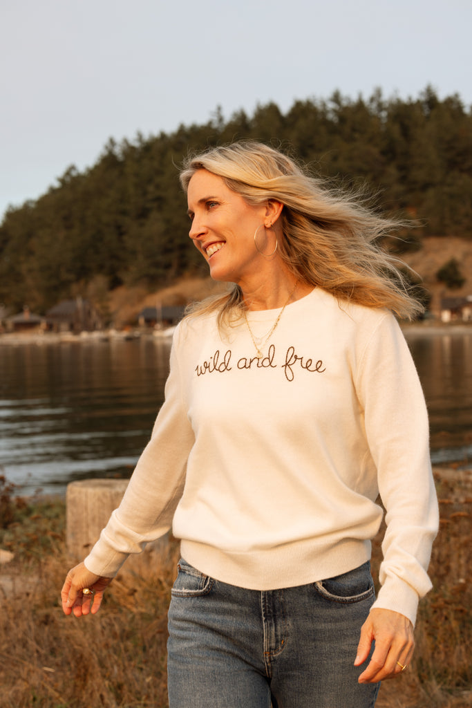A classic cashmere crewneck with "Wild and Free" hand-embroidered across the front. Embroidered heart is centered below statement.