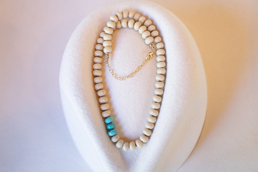Jasper and turquoise 8x5mm rondelles, two-inch 14kt gold filled extender, with brown string.